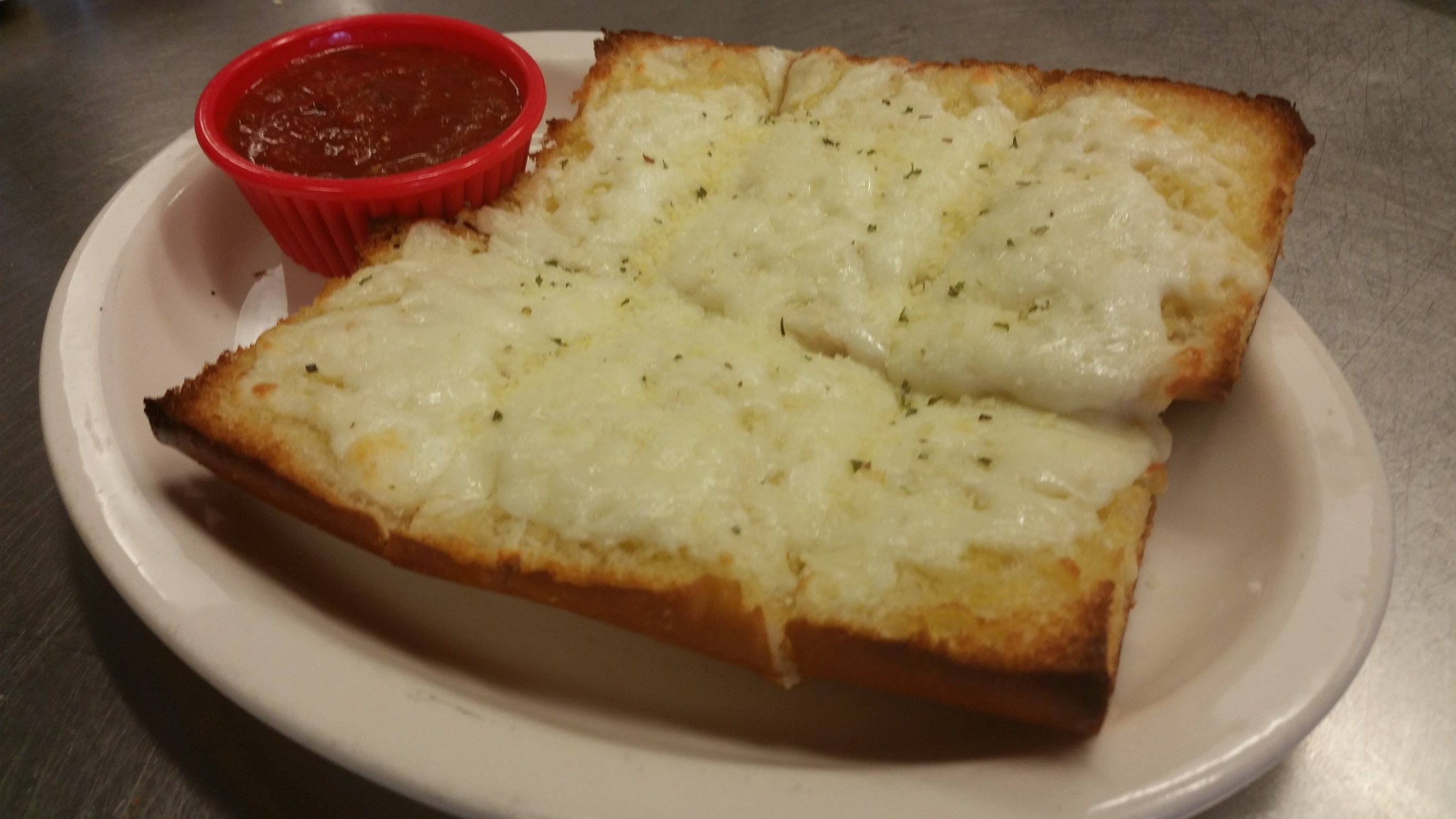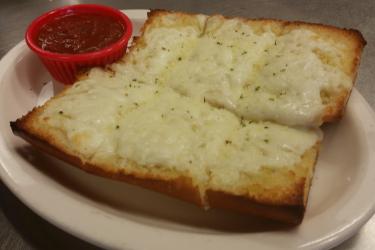Cheesy Bread Cheesy Bread Toasted bread drizzled with garlic butter and topped with the best wisconsin mozzarella cheese. Served with pizza sauce for dipping. $4.25