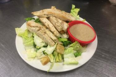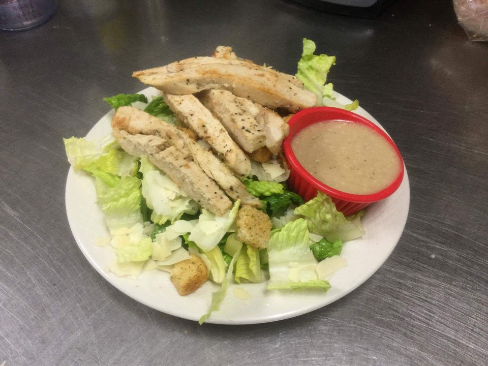 Chicken Caesar Salad Chicken Caesar Salad Crispy romaine lettuce topped with grilled chicken breast, croutons and shredded parmesan tossed in caesar dressing. $9.00