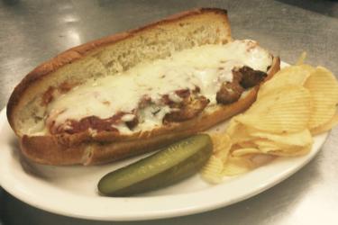 Chicken Parmigiana Chicken Parmigiana Tender Chicken Breast covered with Marinara Sauce melted Mozzarella cheese on a toasted French Italian bread. Add extra topping for .50 cent eachAll Sandwiches are served on Fresh Italian Bread and include A Pickle and Potato $7.50