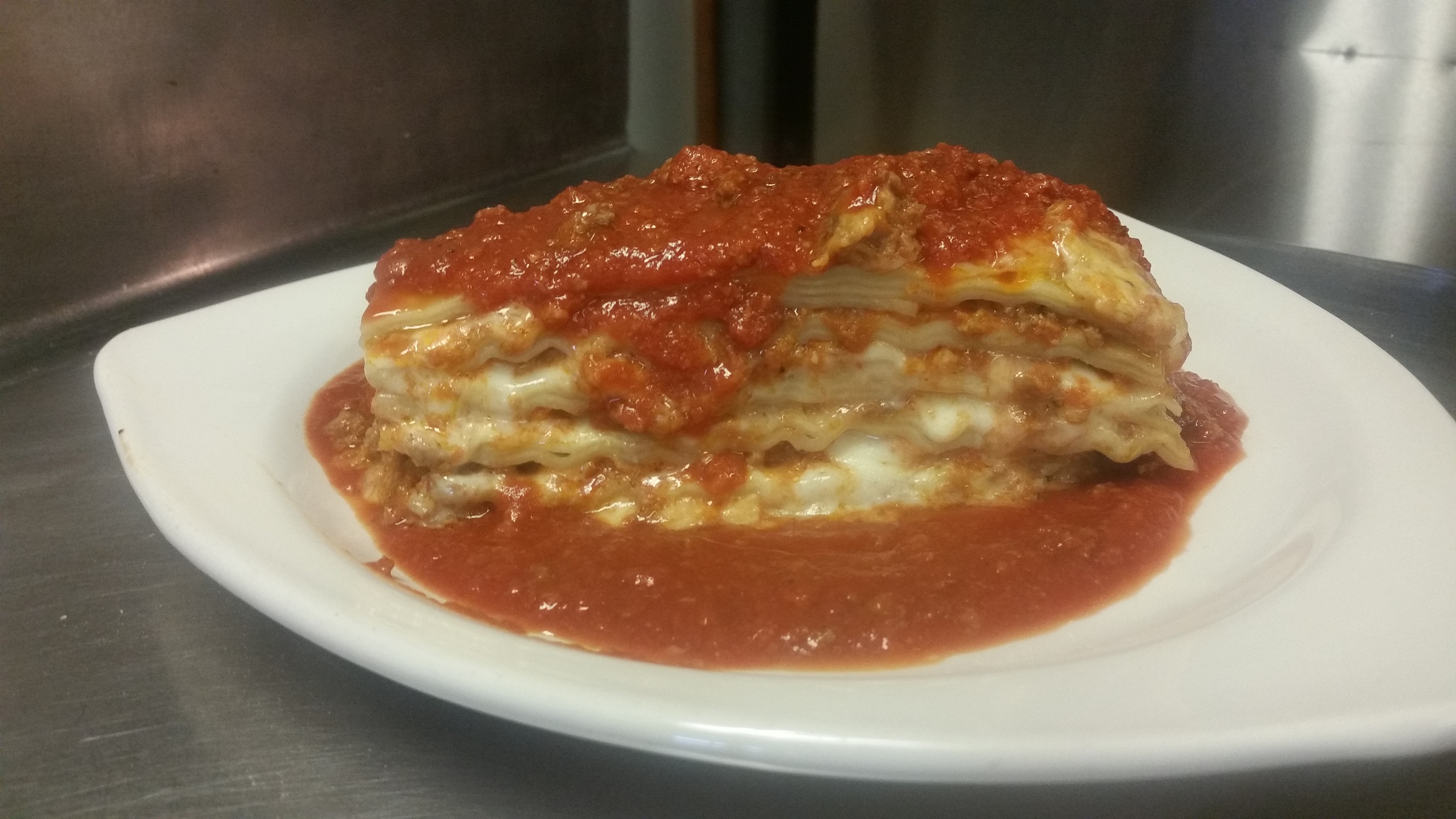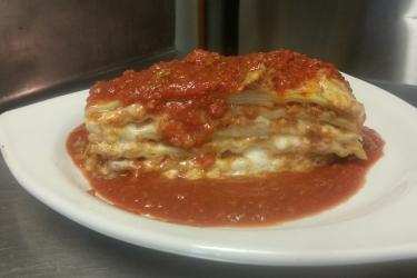 Baked wide pasta with thick layers of Luigi's meat sauce, mozzarella, and parmesan cheese