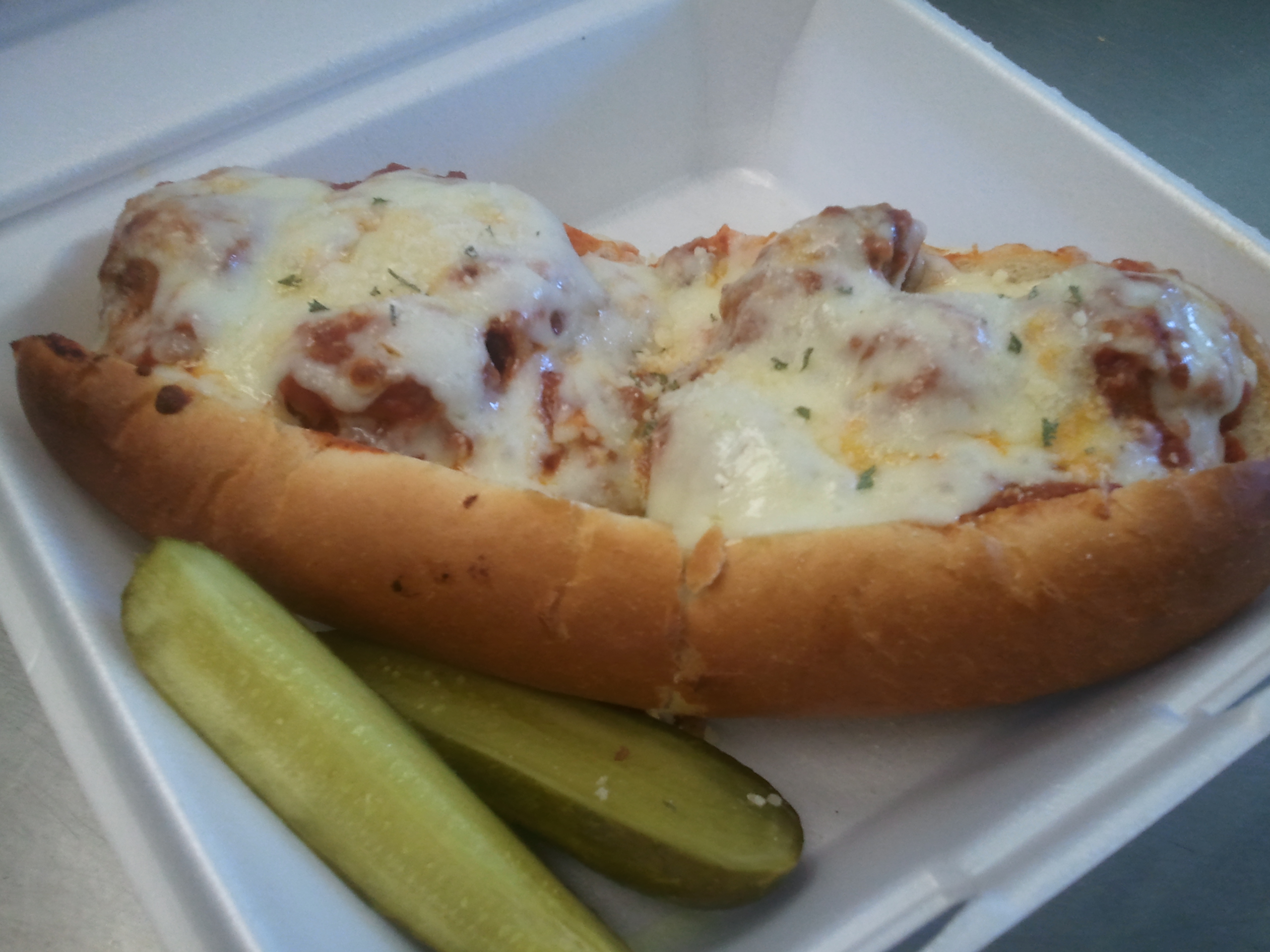 Not Spicy yet delicious homemade Italian meatball drowning in Luigi's meat sauce & topped with melted Mozzarella cheese on a toasted French Italian bread. Add extra topping for .50 cent each